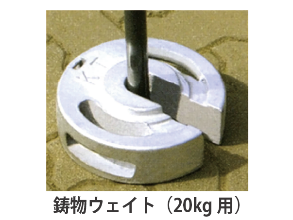 【鋳物ウェイト(20kg)】20kgの重量がある金属製の「おもり」です。テント支柱に設置して、転倒や飛散を防ぎます。