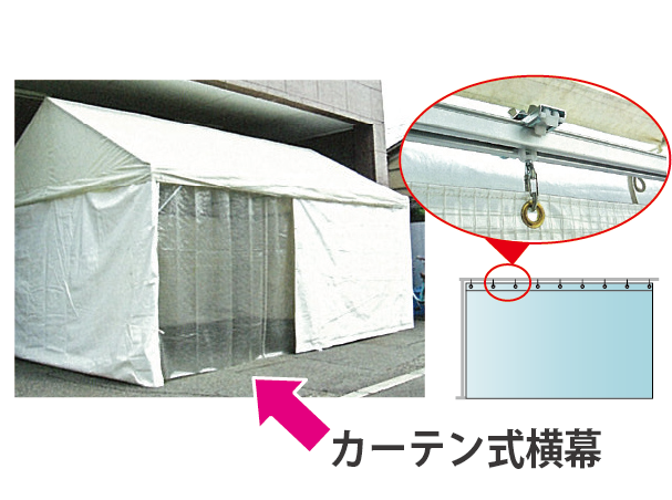【カーテン式横幕】専用レール、パイプバンド付ブラケットなどでカーテンの出入口になります。