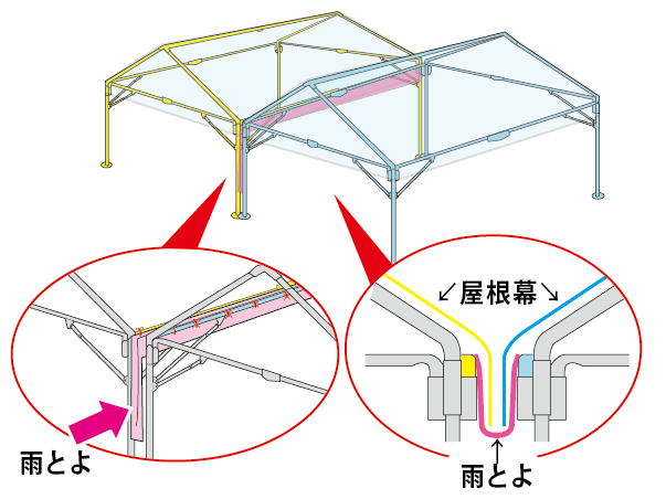 【雨とよ】連結で建てたテント同士の屋根のすき間から雨が入り込むのを防ぐ「雨とよ」。天候に左右されず快適に過ごせます。