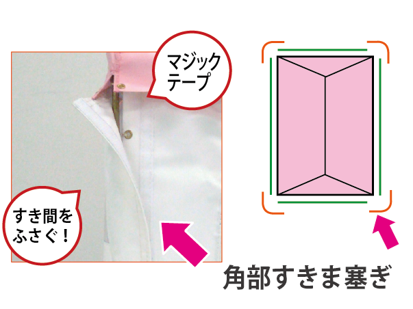 【横幕オプション:角部すきま塞ぎ】横幕のすき間をすっぽり覆う角部のカバー。マジックテープで着脱かんたん。